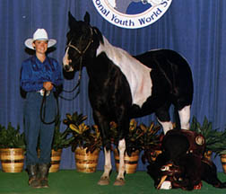 Tru Bruiser 1989 APHA Black Tobiano Stallion (Painted Tru Tru x Lily Quadrille) ROMs Halter, Western Pleasure APHA Points Halter (1 Grand, 4 Reserves), Heeling, Western Pleasure APHA Reserve World Champion Sire Congress Champion Sire Superior Performance Sire ROM Performance Sire |